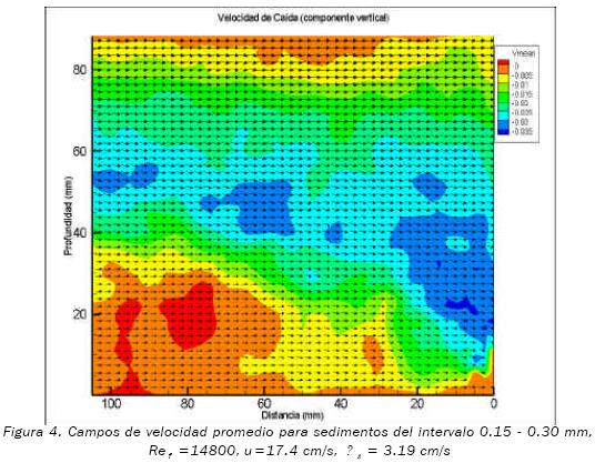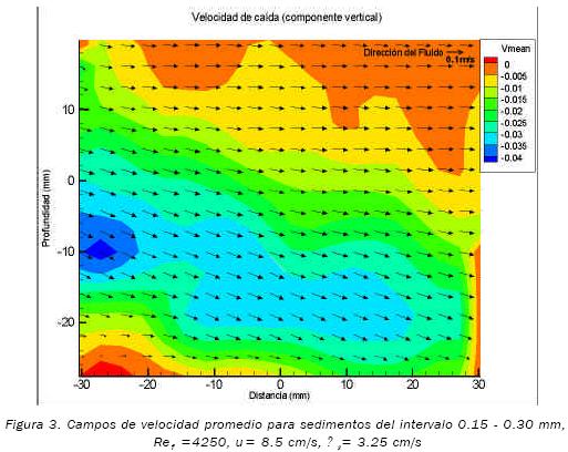 En las figuras 3 y 4, se presenta el valor de la esperanza matemática de los campos de velocidad para el grupo de partículas correspondiente a la muestra con intervalos de diámetros entre 0.15 a 0.30 mm. Estos campos de velocidad se presentan para los valores de 4250 y 14800 del Reynolds del flujo (Ref=uh/ v), correspondientes a las dos condiciones de flujo analizadas. Estas condiciones son; velocidades promedio (u) de 8.5 cm/s y de 17.4 cm/s y tirantes (h) de 5 cm y 8.5 cm, respectivamente. Como se puede apreciar, la velocidad de caída de las partículas varía de acuerdo con la profundidad y horizontal mente en vista de que existe variedad de tamaños de partículas.