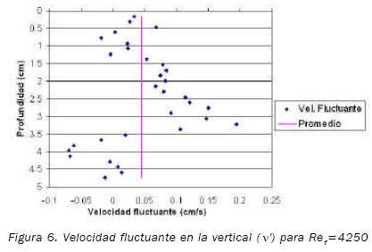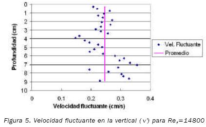 Con el objetivo de determinar la influencia de la turbulencia en la velocidad de caída de las partículas, se calculó la componente en la vertical de la velocidad fluctuante del fluido (v'). Las figuras 5 y 6 muestran los resultados para los dos números de Reynolds del flujo analizados y en la tabla 3 se encuentran los valores promedio calculados para cada uno de los mismos.