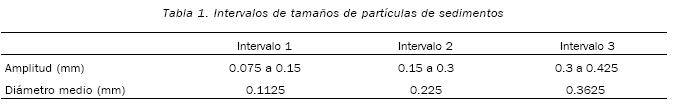 Los experimentos se realizaron considerando condiciones de flujo estacionario en un canal para transporte de sedimentos de 2 m de largo y 10 x 15 cm de sección. Se utilizaron dos valores de caudal líquido, 0.43 l/s y 1.48 l/s, así como diferentes diámetros de partículas de sedimentos. Para medir y calibrar la velocidad del fluido se emplearon como trazadores partículas de poliamida de 25 µm de diámetro. Los diámetros de las partículas de sedimentos analizados variaron entre 0.075 mm y 0.425 mm (Tabla 1). Para la medición de los campos de velocidades se utilizó un sistema de PIV que consiste en un láser pulsado del tipo Nd–Yag, de doble cavidad, marca NEW WAVE, una cámara digital tipo CCD de marca IDT de alta resolución (1036 x 1360 píxeles) para la captura de las imágenes. La cámara antes mencionada, está provista de un lente de 50mm NIKKOR, y se utiliza para capturar un promedio de 100 imágenes por segundo. En la presente investigación, se capturaron en promedio, 100 pares de imágenes para diferentes intervalos de tamaño de sólidos (Tabla 1) con separación de 2, 5 y 10 ms entre cada imagen.