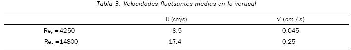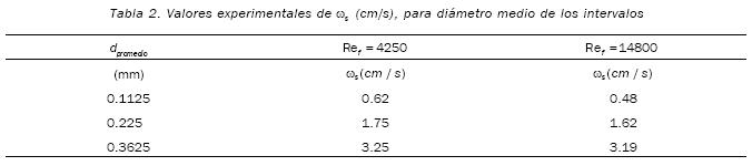 De lo anterior, se puede deducir que las fórmulas empíricas tienen una diferencia promedio con el valor obtenido para Ref =4250 de 16% (la mayor diferencia es para el primer intervalo con 21%) y con el valor obtenido para Ref =14800 de 7.8 % (la mayor diferencia es para el tercer intervalo con 13.7%). Se observa claramente que para flujos turbulentos, los valores de la velocidad de caída dependen de la intensidad de la turbulencia, ya que existe una tendencia a que esta velocidad disminuya con el aumento del número de Reynolds del flujo, como se observa en la tabla 5 para cada tamaño de partícula.
