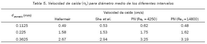 Es indispensable caracterizar adecuadamente las partículas en tamaño y forma, de ahí la necesidad de que estos parámetros no sean supuestos, sino medidos de forma real aplicando técnicas ópticas. En la tabla 5, se presentan los valores de la velocidad de caída, empleando las fórmulas empíricas de Hallermeier (1981) y de She et al. (2005), para los tamaños medios analizados y las obtenidas experimental mente con la técnica PIV.