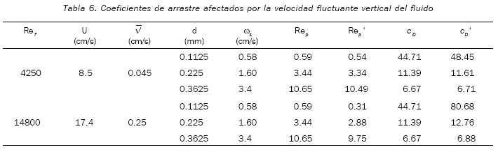 considerando los valores de velocidad fluctuante de la tabla 3 y restando esos valores a la velocidad media calculada con las fórmulas de She et al. (2005), se obtuvieron los valores del coeficiente de arrastre según la expresión (10). La tabla 6 muestra los resultados anteriores, donde el parámetro Rep' representa al número de Reynolds de la partícula afectado por la media de velocidad fluctuante vertical y el correspondiente coeficiente de arrastre es CD'.