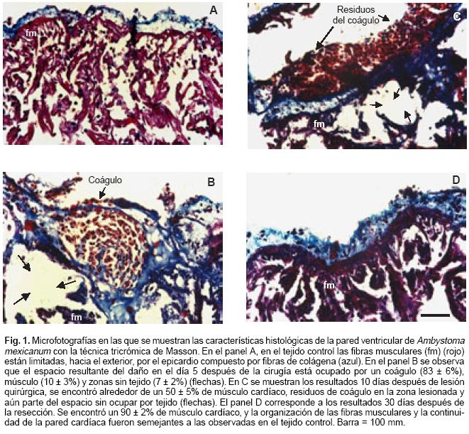 La pared ventricular cardíaca de A. mexicanum control está formada por un miocardio compuesto por fibras musculares cuyas células mostraron un núcleo central teñido de negro y un citoplasma teñido de rojo con la técnica tricrómica de Masson. El miocardio carece de vasos sanguíneos evidentes, y se encuentra delimitado por un epicardio que tiene fibras de colágena, mismas que se tiñen de azul con esta técnica (Fig. 1A).