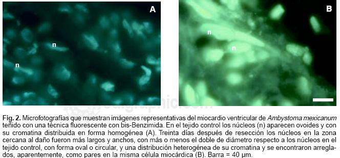 Se realizó resección ventricular en el corazón de Ambystoma mexicanum, se evaluó si la restitución del tejido resulta de hipertrofia o de hiperplasia. Por medio de una tinción tricrómica se encontró que 5 días después del daño en el espacio de la resección se encontró un coágulo rodeado de fibras de colágena (83 ± 6%), músculo (10 ± 3%) y zonas sin tejido (7 ± 2%). Una proporción de 50 ± 4 y 90 ± 2% correspondió a tejido muscular 10 y 30 días después de la lesión. La tinción con bisBenzimida indicó que en la zona lesionada hay proliferación celular. En tanto que la inmunohistoquímica doble para actina sarcomérica a y antígeno nuclear de proliferación celular mostró que el tejido que restituyó el espacio se produjo por proliferación de cardiomiocitos con un valor máximo de 68%, 5 días después de la lesión. Nuestros resultados indican que el miocardio de A. mexicanum recupera su estructura mediante la hiperplasia de cardiomiocitos y sugieren que su capacidad regenerativa es mayor que la informada para mamíferos adultos (1%), y para otros vertebrados no mamíferos (32%). Esto hace de A. mexicanum un modelo idóneo para estudiar los mecanismos reguladores de la regeneración miocárdica per se, en vertebrados adultos in vivo.