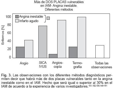 Los síndromes isquémicos coronarios agudos [SICA] con [C] o sin elevación [S] del segmento ST [SST] en todo lo extenso de su espectro clínico, en relación a los aspectos de la fisiopatología y en los rubros que se derivan de ellos, se ha demostrado que es ampliamente compleja; por lo tanto no se ha alcanzado una comprensión completa o integral de los mismos hasta nuestros días, aunque es de reconocerse que sí se ha logrado establecer normatividades clínicas o guías acerca de los mismos que son aplicables en la práctica diaria.1 Por otro lado, no hay duda que las observaciones más recientes que abarcan los aspectos clínicos, los histopatológicos, los bioquímicos y los moleculares son: los que han permitido ahondar en estos temas y despejar interrogantes que resultan fundamentales para un mejor entendimiento de los SICA en todo el panorama que se le conoce hasta la fecha. Desde las informaciones hechas en los años de 1985 por Kohchi R y cols,2 en las llamadas placas coronarias inestables, así como las observaciones validadas por investigadores como: Wallsh E y cols,3 Sato T,4 Baroldi G y cols,5 van der Wai AC y cols,6 y Moreno PR y cols,7 lo que ha sugerido que: el proceso inflamatorio contribuye de manera relevante en la patogenia de este síndrome al estimular la respuesta homeostática y la vasoconstrictora de manera "local". Estas observaciones patológicas, han sido confirmadas por estudios clínicos que se ven asociados a la presencia de "neutrófilos circulantes activados", de linfocitos, de monocitos y de elevadas concentraciones de reactantes de fase aguda como la proteína C reactiva de alta sensibilidad [PCRHS] en enfermos con angina inestable, por lo tanto existen además datos fehacientes tanto de un proceso humoral y celular de orden o naturaleza sistémica y no sólo local.816 Aspectos que son independientes o que no están asociados a la presencia de micro mionecrosis o de macro lesión miocítica, al demostrarse que tanto las troponinas como la creatinacinasa permanecen dentro de lo normal.16 Por otro lado, ensayos experimentales han aclarado que períodos breves del binomio isquemiareperfusión son poderosos estímulos proinflamatorios que inducen la activación de los leucocitos y del complemento, producción de citocinas y de proteínas de la fase aguda. Estos hechos clínicos como los obtenidos en el laboratorio han retado o confrontado nuestros conceptos tradicionales en la fisiopatogenia de los SICA.1724De hecho, no es infrecuente que al demostrar la presencia de una estenosis crítica coronaria en un segmento de este árbol vascular arterial, esta situación es sólo una parte o una fracción de todo lo que acontece en el territorio arterial del miocardio. Hoy día, en principio es considerado un error, pensar o concebir al IAM del ventrículo derecho (VD) como una enfermedad ateromatosa privativa de sólo la arteria coronaria derecha [ACD] o eventual de la arteria circunfleja [ACx].25 Así mismo, la ruptura o la erosión de la capa superficial o íntima de una placa vulnerable se ha visto asociada con fenómenos de trombosis en otros sitios donde la mencionada estructura no tiene las características de ser crítica para la circulación. Información que ha hecho que nuestros recursos terapéuticos no sólo se enfoquen en la placa que consideramos como crítica e inestable, sino también en dirigir nuestros esfuerzos en identificar aquellas otras que sin ser funcionalmente anormales sí son vulnerables, mismas que por lo general no son reconocibles en la tradicional angiografía coronaria. Así, de esta manera, aplicar el recurso terapéutico de forma local y así evitar o prevenir el hacer profilaxis sobre la aparición de futuros episodios coronarios agudos. Máxime cuando los estudios donde se han ensayado terapias medicamentosas con miras a estabilizar las lesiones de estos enfermos, requieren de meses o tal vez años para alcanzar de manera final esta meta. La intención de esta revisión por lo tanto es hacer énfasis en este aspecto que se notó hace ya varios años en los SICA; sin embargo, no se le prestó la debida atención, ni académica, ni clínica, que hoy es señalado como un aspecto relevante de la fisiopatología moderna de los SICA y que además tiene verdaderas implicaciones terapéuticas para un grupo de enfermos que en principio no luce minoritario dentro del horizonte de esta patología coronaria aguda. Con tal fin iremos desarrollando aspectos que hemos juzgado pertinentes para esta temática, que nos hacen girar nuestro pensamiento de la placa vulnerable solitaria a la múltiple, en donde la "inflamación local" va hacia la transcoronaria y en el que el denominador de fondo es la inflamación sistémica de manera actual, mas lo es como un importante integrante de las manifestaciones trombóticas de la aterosclerosis.