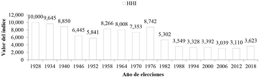 Como se ha comentado anteriormente, en el presente estudio se analiza la situación competitiva electoral en México para el periodo 1928-2018, para ello se emplea el HHI, índice que estima el grado de concentración en un sistema. Por lo tanto, se ha llevado a cabo el cálculo de dicho índice con los siguientes resultados.