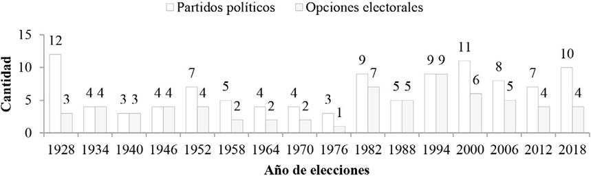 Con el fin de complementar los datos obtenidos mediante el HHI, en la gráfica 2 se representan los distintos partidos políticos que se han posicionado en cada una de las elecciones en el periodo 1928-2018, así como las diversas opciones electorales por elección. Incluso puede decirse que dicha gráfica fungiría de manera indirecta como parámetro de competitividad electoral, medida en número de opciones electorales.