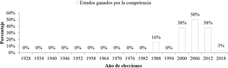Además, se ha analizado el número de opciones electorales así como el porcentaje de estados ganados por un candidato distinto al candidato electo, evidencia que confirma mayores niveles de competitividad en las últimas décadas.