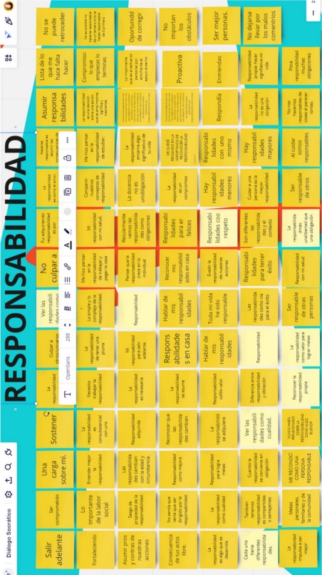 La identificación de enunciados -comentaron los tres colegas del equipo- implicó que los investigadores ubicáramos palabras específicas ligadas a alguno de los ejes de análisis. Estas palabras y, en ocasiones, frases breves en las que desarmamos los textos de las bitácoras, se colocaron en papeletas electrónicas que agrupamos según sus colores en dos tableros de la aplicación Miro-Visual Collaboration, uno para el material extraído de las bitácoras de la experiencia presencial y otro para las de los diálogos mediados por el soporte electrónico (ver imagen).