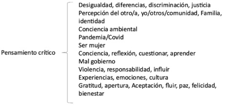 Los tres conjuntos iniciales se desdoblaron en subcategorías o ejes secundarios. De ese modo, las papeletas amarillas, correspondientes a pensamiento crítico, por ejemplo, se fueron agrupando por afinidad semántica en grupos más pequeños como el que presentamos: responsabilidad, discriminación, desigualdad, diferencia, género, medio ambiente, la percepción del/la otro/a, violencia, cultura…; lo mismo se hizo con los otros dos grupos (ver anexo 3). Este ejercicio, al tiempo que permitió constatar, por ejemplo, el flujo de cuestionamientos y procesos de depuración razonada propios del pensamiento crítico durante los diálogos, mostró las vertientes por donde dicho pensamiento discurre y, con ello, nos ofreció los contornos de una noción más precisa del talante crítico que se fragua durante la práctica de un diálogo intercultural.