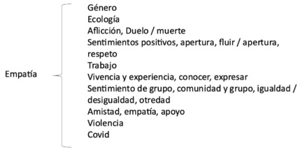 El enunciado “Me preocupé demasiado porque sentí que Ximena es una persona totalmente vulnerable. Me agarró cierta impotencia porque no le podía ofrecer soluciones mágicas a su situación”, se relaciona con el eje de la empatía a través de categorías como “me preocupé” e “impotencia”. Así, el trabajo tenía dos niveles. Por un lado, calificar las bitácoras, leyendo los textos e identificando enunciados relacionados con los ejes del proyecto y, en un segundo momento, extraer categorías simples de cada enunciado, desarmando el rompecabezas en una expresión mínima (cfr. Hernández et al., 2022).