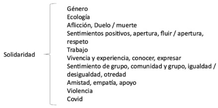 Posteriormente, procedimos a identificar y clasificar enunciados y palabras conforme a las tres categorías básicas del proyecto, entendidas en un sentido básico. Marcamos en azul las frases y vocablos correspondientes a la solidaridad, en verde para empatía y amarillo para pensamiento crítico. Un ejemplo de enunciado representativo del pensamiento crítico es: “Me di cuenta, sobre todo, que lo que yo pensaba de los migrantes estaba absolutamente sesgado por lo que escucho en los medios de comunicación y por las películas que veo que hablan del tema. Es decir, no todos son ni pobres de mente ni económicamente”. Este tipo de expresiones fueron subrayadas en amarillo y agrupadas con las demás frases o palabras correspondientes a la misma categoría:
