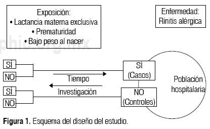 Methods. We carried out a case-control study with a sample size of 366 children (122 cases and 244 controls) (a = 5%; b = 20%). A questionnaire was completed through direct interview with the parents to assess allergic rhinitis symptoms in order to classify the children as cases or controls. Previous medical history such as birth weight, gestational age and exclusive breastfeeding were entered and verified with the clinical chart of the patients as well as with the growth and development chart.