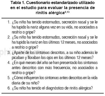Para establecer el diagnóstico de RA se utilizó un cuestionario estandarizado internacionalmente y validado en nuestro medio, que fue empleado anteriormente en un estudio de prevalencia de RA en la ciudad de Lima, el cuestionario ISAAC (International Study of Asthma and Allergies in Childhood).5,13 Su valor predictivo positivo para atopia en niños con síntomas es de 63% cuando referían rinorrea acompañado de síntomas oculares, y de 67% cuando los síntomas aparecían durante períodos de polinización.7 El estudio SCARPOL validó el cuestionario ISAAC en una población de escolares con rinitis en Suecia (n=2954) comparado con la prueba cutánea de reacción. En esta evaluación, se determinó una especificidad del cuestionario del 77.5 al 97.6%, aunque una sensibilidad baja (2.6 al 42.7%).14 Existen cuestionarios más detallados, como los de Redline y cols. (sensibilidad de 83% y especificidad de 61% para diagnóstico de RA);15 a pesar de esto, preferimos utilizar el cuestionario ISAAC (Tabla 1) por haber sido ya validado en nuestro medio y por la experiencia de anteriores estudios realizados en nuestro país.
