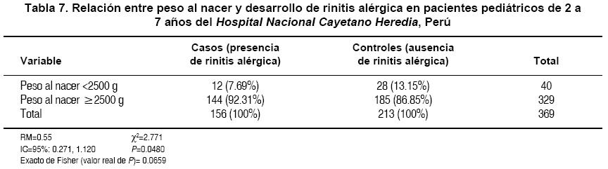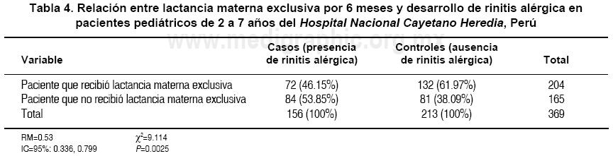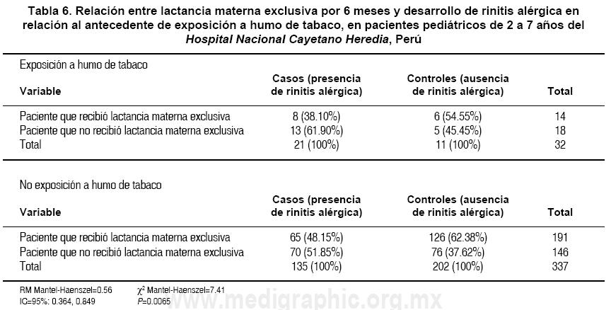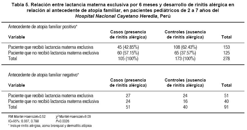 Resultados. Ingresaron 369 niños de 2 a 7 años que acudieron a consulta externa de pediatría del Hospital Nacional Cayetano Heredia, entre agosto del 2006 y junio de 2007; de estos, 156 cumplieron con los criterios de caso y 213 cumplieron con los criterios de controles. Se encontró una razón de momios (RM) de 0.53 (IC 95%, 0.35, 0.80, P=0.0025) para la asociación entre rinitis alérgica y lactancia materna exclusiva. La razón de momios para rinitis alérgica y bajo peso al nacer fue de 0.55 (IC 95%, 0.27, 1.12, P=0.0658) y para rinitis alérgica y prematuridad fue de 1.20 (IC 95%, 0.67, 2.17, P=0.5414). Se realizó, además, el análisis estratificado para la relación entre rinitis alérgica y lactancia materna exclusiva con las variables de antecedente de atopia familiar y de exposición temprana a humo de tabaco, se utilizó como prueba estadística la prueba de Mantel-Haenszel. Se encontró una razón de momios Mantel-Haenszel de 0.52 (IC 95%, 0.33, 0.78, P=0.0025) para la asociación entre rinitis alérgica y lactancia materna exclusiva con el antecedente de atopia familiar; y una razón de momios Mantel-Haenszel de 0.56 (IC 95%, 0.36, 0.84, P=0.0064) para la asociación entre rinitis alérgica y lactancia materna exclusiva con el antecedente de exposición temprana a humo de tabaco.