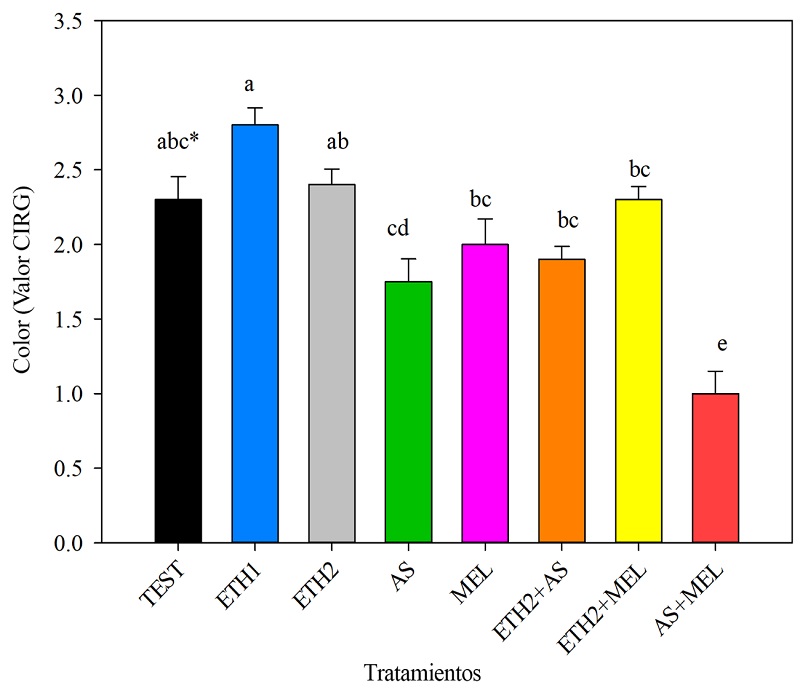 El valor bajo de CIRG en las bayas pudo deberse a un retraso, por un lado, en la degradación de clorofilas por efecto del tratamiento de MEL y AS (Wu et al., 2021; Yadav et al., 2022) y, por otra parte, en la disminución de la acumulación de antocianinas por la influencia de la temperatura máxima presente en el momento del experimento (≥ 37 °C) (Boss y Davies, 2009; SMN, 2021).