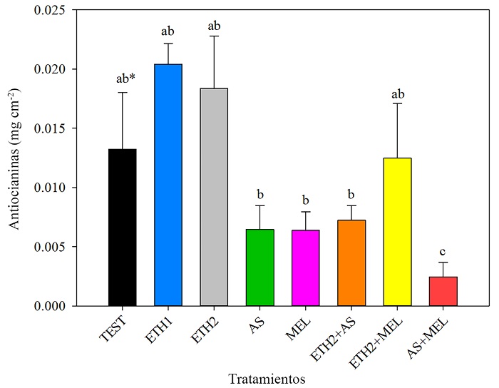El mayor contenido de antocianinas totales se presentó en las bayas tratadas con ETH1 y ETH2 al obtenerse un contenido total de 0.021 y 0.019 mg cm-2 respectivamente (Figura 2). Los tratados con ETH fueron estadísticamente diferentes con todos los tratamientos a excepción del TEST (0.013 mg cm-2) y ETH2+MEL (0.0125 mg cm-2); por el contrario, las bayas tratadas con AS+MEL presentaron la más baja concentración con solo 0.002 mg cm-2. Resultados similares reportaron Peppi et al. (2006) con valores de 0.017 mg cm-2, 0.015 mg cm-2 y 0.013 mg cm-2 de antocianinas cuando aplicaron antes, durante y después del envero respectivamente 250 mg L-1 de Ethrel en uva de mesa “Flame Seedless” en las diferentes etapas.