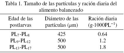 El diámetro de las partículas del alimento balanceado y la ración diaria, se establecieron de acuerdo a las relaciones mostradas en la Tabla 1. La ración diaria se dividió en cuatro porciones iguales que se aplicaron cada seis horas, y cada 12 horas se hizo el ajuste necesario para mantener la concentración de nauplios de artemia en una densidad de 2 nauplios por mililitro. Durante el transcurso del experimento no se manipularon las postlarvas para evitar la mortalidad debida al manejo de las poblaciones, por lo que la ración alimenticia fue establecida de acuerdo al número original de organismos sembrados en cada acuario.
