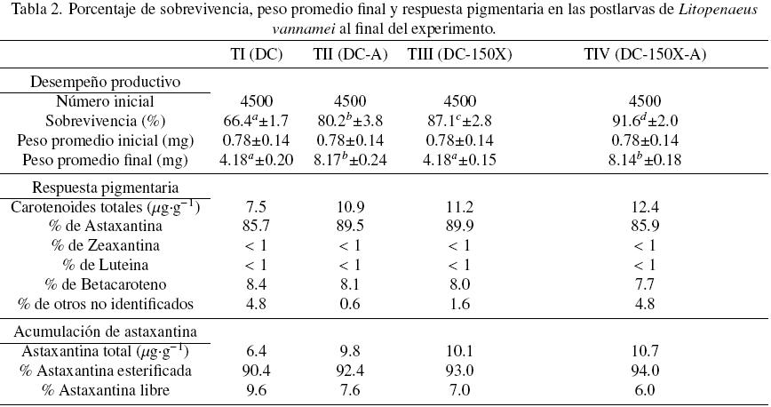 La dieta de alimento comercial suplementado con xantofilas (TIII: DC-150X), así como la dieta de alimento comercial no suplementado mas nauplios de artemia (TU: DC-A), produjeron un incremento significativo de la sobrevivencia de las poblaciones experimentales (Tabla 2). Se observó además un efecto acumulativo del uso conjunto de las xantofilas y los nauplios de artemia, ya que la mayor sobrevivencia se registró en las poblaciones que recibieron ambas fuentes alimenticias adicionales (TIV: DC-150X-A). El peso individual promedio final, fue más alto en las poblaciones que recibieron nauplios de artemia, independientemente de haber recibido o no el alimento comercial suplementado con xantofilas (TU: DC-A y TIV: DC-150X-A), con valores que prácticamente doblaron el peso registrado para las poblaciones que no consumieron nauplios (TI: DC y TIII: DC-150X).
