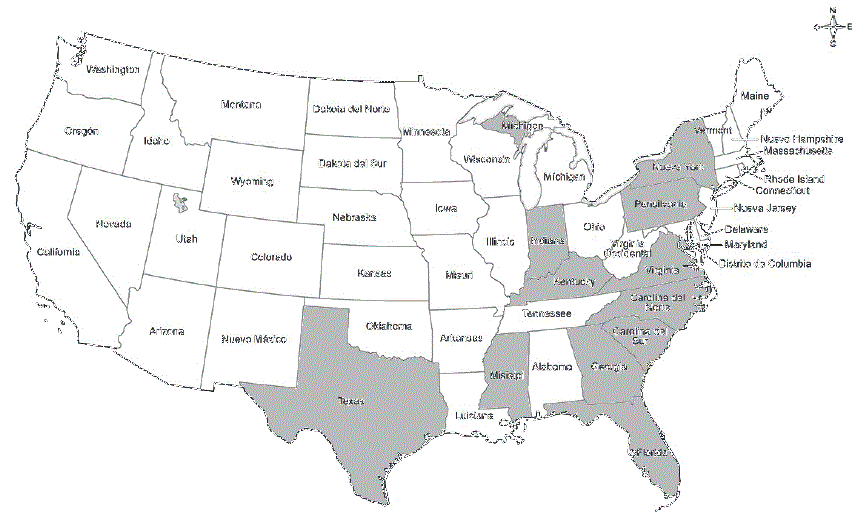 Mapa 1 Entidades de Estados Unidos destino principal de los migrantes tsotsiles de Los Altos de Chiapas