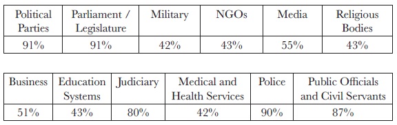 However, when asked about the percentage of corruption in the country's institutions, the vast majority of the respondents felt that institutional structures were highly corrupt, as shown below:
