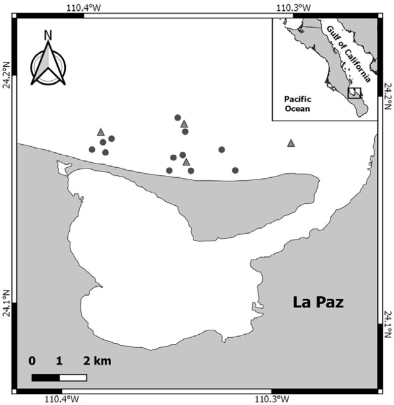 Figure 1 Bahía de La Paz in the Gulf of California (inset map) shown in main perimeter. Non-feeding sample stations (▲) and locations of sampled feeding events (O) of whale sharks.