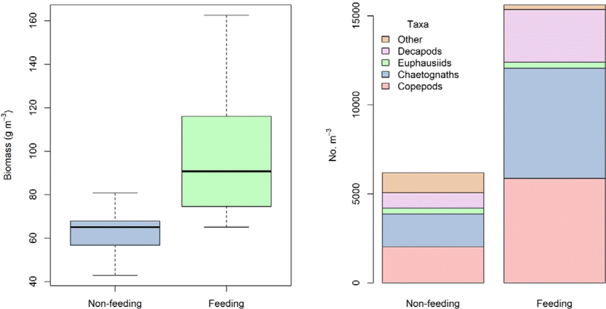 Figure 2 Biomass (left panel) and mean absolute values of the contributions of each taxonomic group to the total number of individuals (right panel) in feeding and non-feeding events of whale sharks.