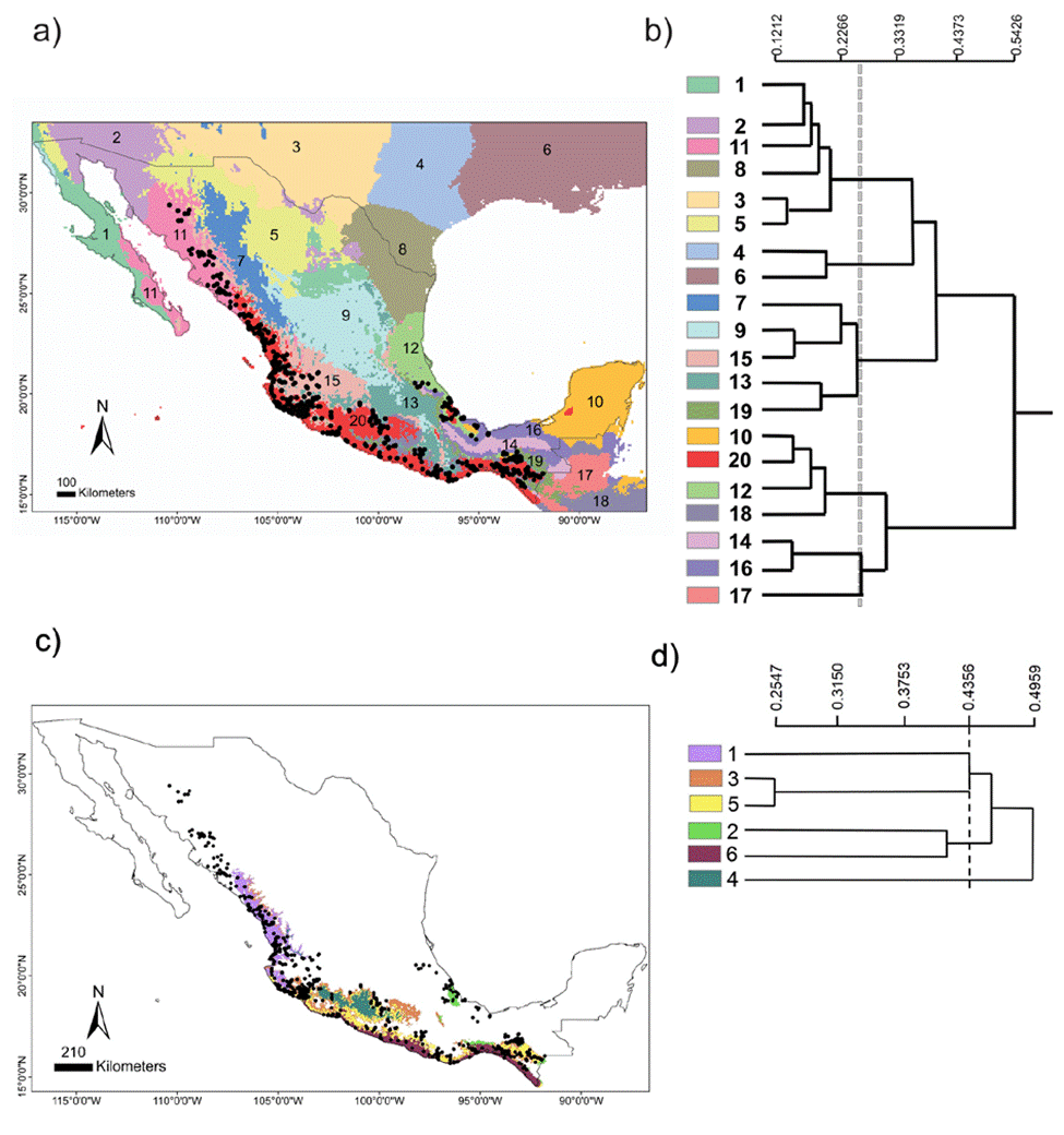 Figure 2 National scale: (a) geographical distribution of the 20 environmental domains for Mexico, numbered 1 to 20 and depicted by different colors. Black circles represent the location of species occurrences taken from the Global Biodiversity Information Facility (GBIF; www.gbif.org) for Heteromys pictus. Regional scale: (c) geographical distribution of the 6 environmental domains (from the Coastal Pacific, the environmental domain associated with the distribution of Heteromys pictus; see Results), numbered 1 to 6 and depicted by different colors (colors in the online version). Location of the Estación Biológica Chamela (EBC) and the Parque Nacional Huatulco (PNH) areas is shown. (b, d) Dendrogram depicting similarity levels between domains (similarity values shown on the upper scale).