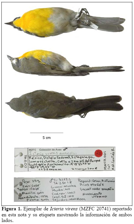 El ejemplar fue identificado como Icteria virens auricollis, considerando que en esta subespecie usualmente la longitud de la cuerda alar es menor que la de la cola (cuerda alar 78.9 mm, cola 83.0 mm, Pyle 1997). Se trata de un macho adulto (osificación total del cráneo, testículos 3.1 x 2.2 mm, sin bursa), sin muda, el plumaje sin desgaste aparente y con una importante reserva de grasa. El individuo fue preparado en forma de piel de estudio y se tomaron muestras de tejidos (músculo, corazón e hígado). Todo el material fue depositado en la Colección Ornitológica del Museo de Zoología de la Facultad de Ciencias, UNAM (MZFC 20741; Figura 1). Este es uno de los pocos ejemplares colectados en el Valle de México y el más reciente, no es una especie común en el Distrito Federal (Wilson y Ceballos-Lascuráin 1993, del Olmo 2007). Los registros previos (Figura 2), se encuentran depositados en colecciones extranjeras y en algunos casos no se especifica la fecha de colecta o localidad. En el Field Museum of Natural History de Chicago se encuentra un ejemplar de I. v. virens (FMNH 297415) sin especificar fecha de colecta y "Mexico City" como localidad; en el Museum für Naturkunde de Berlín está depositado un ejemplar (cat. 5882) colectado por F. Deppe en la Ciudad de México, en junio de 1826, y en el British Museum of Natural History se encuentra el único ejemplar con datos detallados de colecta (Huipulco, Distrito Federal), colectado en 1888 por Fernando Ferrari Pérez (BMNH 92.4.20.1628). De manera adicional, se cuenta con un sólo registro visual del 5 de octubre de 1978 en los Dinamos, Magdalena Contreras (Wilson y Ceballos-Lascuráin 1993).