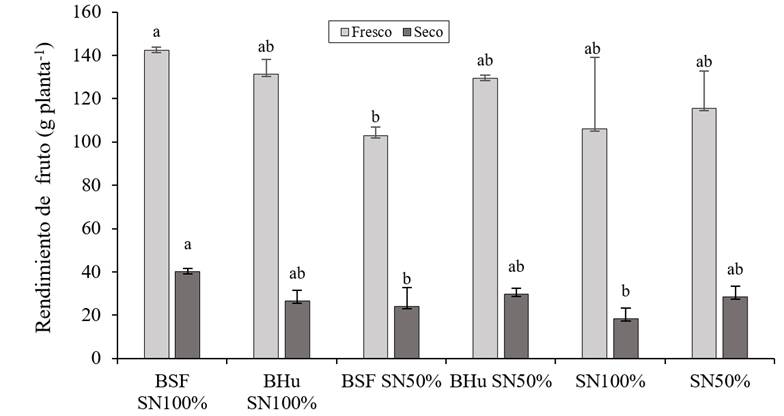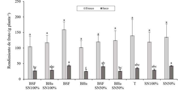 Se observó diferencia estadística significativa entre tratamientos. Para el rendimiento de fruto fresco el tratamiento BSF SN100% se presenta como el mejor con 142.3 g planta-1 le sigue BHu SN100% con 131.3 g planta-1, los tratamientos restantes presentan cifras menores (Figura 2).