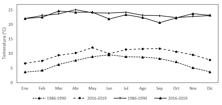 De acuerdo con la disponibilidad de los datos históricos registrados en los sitios de estudio, corresponden a tres periodos: el primero de 1956 a 1960, el segundo a los años de 1986 a 1990 y el actual del 2016 al 2019. Posteriormente se compararon para conocer las diferencias entre estos tres periodos de tiempo (Cuadro 1).