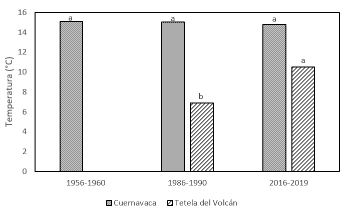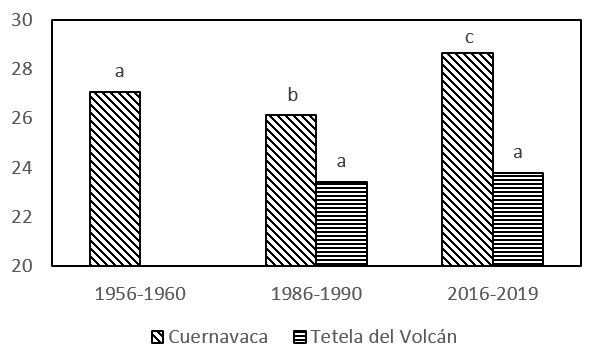 De acuerdo con análisis de LSD de Fisher, Cuernavaca presentó diferencias significativas en sus temperaturas máximas, entre los periodos 1956-1960, 1986-1990 y 2016-2019, con 27.08 °C, 26.13 °C y 28.68 °C respectivamente, siendo el periodo más reciente el más cálido con un aumento de 2.55 °C, lo cual muestra que en estos últimos años se han registrado temperaturas más altas que en los periodos anteriores. Sin embargo, se identificó que Tetela del Volcán no registró diferencias significativas entre los periodos de análisis (Figura 3).