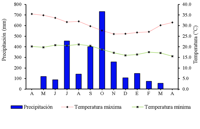 El experimento se realizó en condiciones de temporal durante abril de 2011 a abril de 2012, en el Campo Experimental del Colegio de Posgraduados, Campus Tabasco, México, ubicado en el km 21 de la carretera Cárdenas-Coatzacoalcos. Las coordenadas son 17°59’15.6” N y 93°35’06.9” O, a 12 msnm. El clima del lugar es del tipo Am y corresponde al cálido húmedo, con lluvias en verano. La precipitación total anual es de 2,251 mm y la temperatura promedio anual de 26 °C11. La precipitación registrada en el periodo de evaluación fue de 2,576 mm, con una distribución de 6.9, 70.3 y 22.8 % en las épocas de seca, lluvias y nortes, respectivamente, donde el mes más lluvioso fue octubre, con 723 mm; mientras que la temperatura promedio fue de 24.4 °C, con promedios de 25.6, 25.7 y 21.8 °C en las épocas de seca, lluvias y nortes, respectivamente, donde la temperatura máxima (35.3 °C) se alcanzó en el mes de abril y la mínima (16.0 °C) en diciembre (Figura 1). El suelo se clasifica como Cambisol, textura franco arcilloso, pH 5.5, MO 1.9 %, N 0.14 % y P 21.4 mg kg-1.