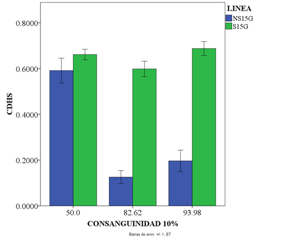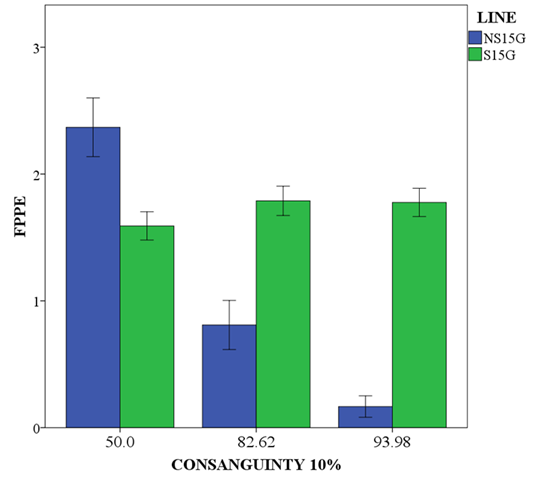 Hubo un efecto altamente significativo (P<0.01) de depresión endogámica en S15G, en la VR, CNPP y CDPP, mientras que CNAC, CDEST, EPPF y CDHS no fue significativo (P>0.05); en NS15G, las características EPPF, VR, CNAC, CDEST y CDHS mostraron un efecto altamente significativo (P<0.01) de la depresión endogámica, sin embargo, en CNPP y CDPP, fue no significativo (P>0.05) (Cuadro 3).