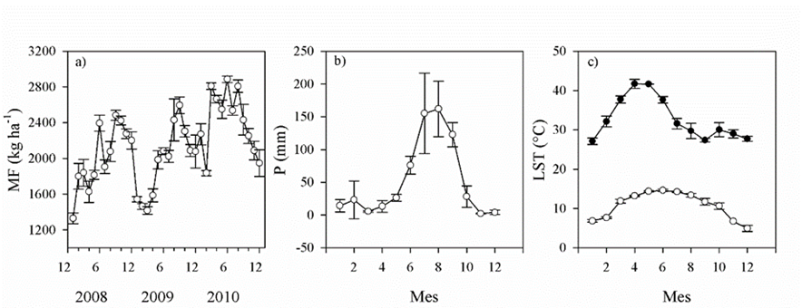 Figura 1 Variables ambientales y producción de masa de forraje de pradera mixta de alfalfa y pastos templados pastoreada con ganado de carne: a) masa de forraje (MF), b) lluvia (P) y c) temperatura de superficie (LST) diurna (●) y nocturna (○)