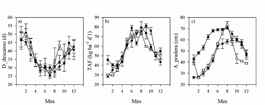 Figura 2 Manejo de pradera mixta de alfalfa y pastos templados pastoreada con ganado de carne durante 2008 (●), 2009 (○) y 2010 (■): a) Días de descanso antes del pastoreo, b) tasa de acumulación de forraje (TAF) del periodo, c) altura del forraje