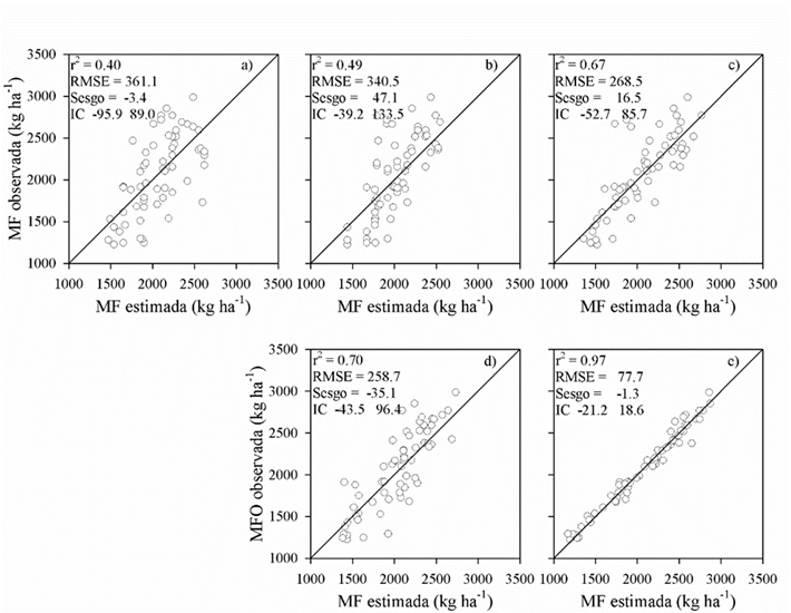 En la regresión MA el intercepto fue numéricamente cercano a 0 en el escenario ML_PR_MP y su pendiente fue igual a 1, un modelo con pendiente igual a 1 e intercepto igual a 0 indica buen ajuste. El valor menor del RMSE, AIC, BIC y devianza sugirieron una mejor representación de la MF con el escenario ML_PR_MP (Cuadro 1). En el análisis de devianza la comparación entre dos o más modelos será válida si se ajustan al mismo conjunto de datos, este requisito no se cumplió porque los valores predichos de MF fueron inherentemente distintos para cada modelo generado. La diferencia de devianzas se distribuye aproximadamente como X2 con grados de libertad iguales a la diferencia en el número de parámetros entre los modelos14, siendo esta diferencia 0 para el caso de los modelos de regresión lineal simple usados para representar la relación entre valores estimados y predichos en cada escenario de modelación. Por estas dos razones la elección del mejor modelo se basó únicamente en el valor numérico de las medidas de bondad de ajuste. El peor modelo fue la regresión lineal entre MF y A_pradera, no solo en función de las medias de bondad de ajuste sino también en la representación gráfica de los valores estimados vs. observados (Figura 3).