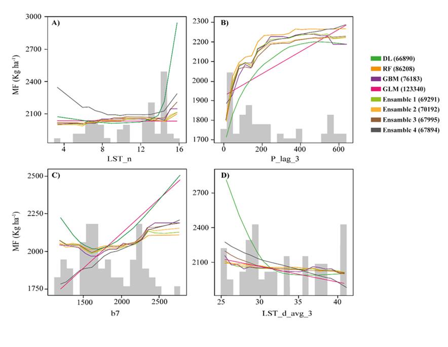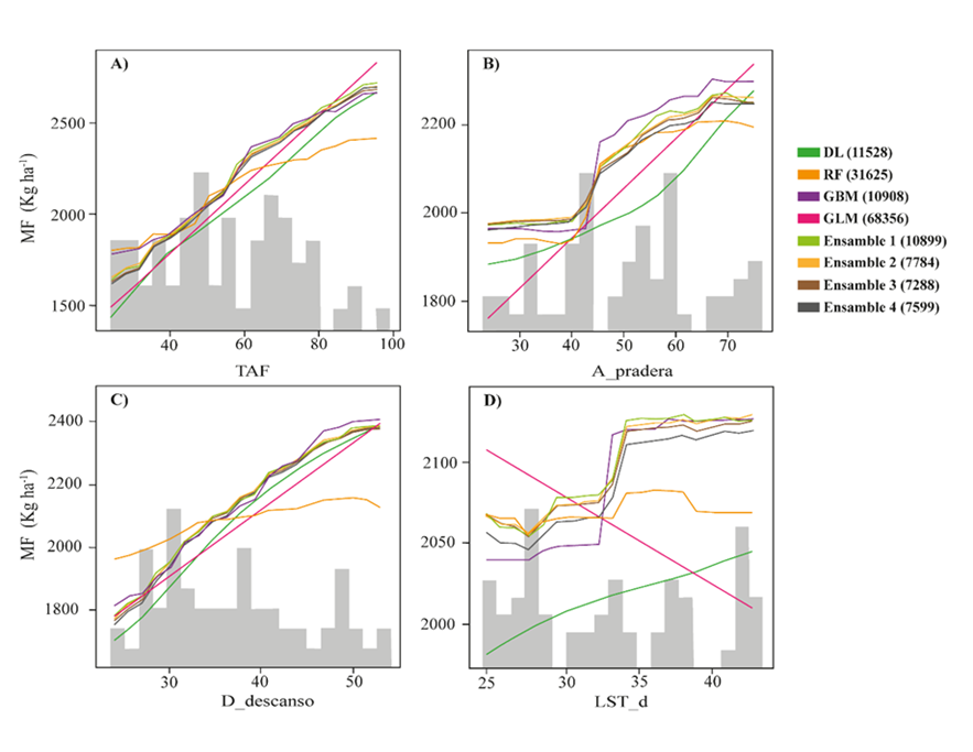 La dependencia parcial que existió entre la predicción de MF y el valor de algunas de las variables de mayor importancia en algunos modelos ML se muestra en la Figura 4, en el escenario ML_PR y en la Figura 5 para el ML_PR_MP. Los ensambles de modelos ML tuvieron menor devianza en comparación con algún algoritmo ML en los dos escenarios y por tanto se consideraron mejores representaciones de la MF. Las figuras de dependencia parcial indican cómo la variable explicativa influye en las predicciones de uno de los modelos o ensambles, después de estandarizar el efecto de otras variables. Para modelos de regresión lineal (como el modelo GLM obtenido por ML), la figura es una línea recta con pendiente igual al parámetro del modelo32. La MF dependió directa y proporcionalmente de las variables TAF, A_pradera y D_descanso en diferentes modelos incluso para un modelo GLM (línea rosa), pero para las variables P_lag_3 y LST_d la dependencia difirió entre el modelo GLM y los modelos ML, particularmente el modelo de tipo DL (línea verde obscura) que fue el mejor modelo ML individual (Figura 5). La interpretación de las figuras se mejora con el histograma de frecuencia de las observaciones, en función del valor de la variable. Donde hubo menor frecuencia de datos se interpretó que la dependencia no fue soportada por suficiente evidencia. Un ejemplo de esta situación fue la dependencia de LST_n en la Figura 4 donde el modelo de tipo DL tiene un ascenso abrupto, pero los dos últimos intervalos de clase del histograma tienen pocas observaciones.