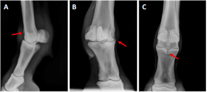 Grade 1 (A) Lateromedial view with a mild irregularity of the proximal-dorsal aspect of the sagittal ridge (arrow); Grade II (B) Dorsolateral palmaromedial oblique view with a visible osteophyte on the proximal dorso-medial aspect of P1 (arrow); and Grade III (C) Dorsopalmar view where a subchondral bone cyst in the proximal aspect of first phalanx in the sagittal groove with areas of bone sclerosis (arrow).