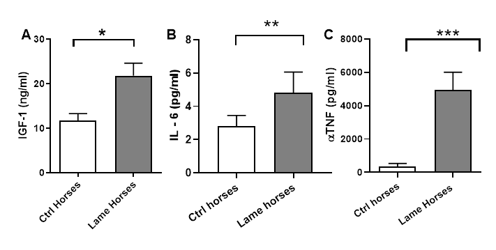 Figure 2 A) IGF-1 determination between control (sound) and lame horses, demonstrating a significant difference (P<0.05)*. B) Concentrations of IL-6 between controls and lame horses, showed a significant difference as well (P<0.01)**. C) TNF( concentrations between controls and lame horses showing significant differences in concentration (P<0.001)***.