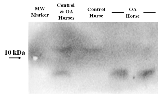 1: Protein marker (marking 10 kDa); 2: Samples from a control horse and a horse with OA; 3: Control horse; 4 & 5: Two different samples from horses with OA.