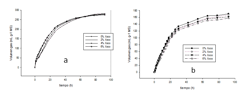 La caracterización fisicoquímica de los sustratos (rastrojo de maíz y xoconostle) y de los tratamientos establecidos: 100 % maíz-0% xoconostle (0%Xoco); 98 % maíz-2% xoconostle (2%Xoco); 96 % maíz-4% xoconostle (4%Xoco) y 94 % maíz-6% xoconostle (6%Xoco) se llevó a cabo mediante análisis proximal, determinando: contenido de humedad; contenido de minerales (Mi); extracto etéreo (EE); proteína cruda (PC); fibra cruda (FC)11. La proporción de fibra detergente neutro (FDN) y fibra detergente ácido (FDA) se determinó de acuerdo con lo descrito por Van Soest12, las digestiones se llevaron a cabo utilizando bolsas filtro (Ankon F57 USA). En ambos casos se usó una bolsa sin sustrato como blanco para efectuar los cálculos.