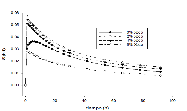 Los parámetros cinéticos resultantes del ajuste al modelo Logístico se muestran en el Cuadro 3 y mediante la Ecuación 4, determinan tsmax para los tratamientos del estudio siendo de 5.3, 2.8, 0.9 y 1.1 h para 0% Xoco, 2% Xoco, 4% Xoco y 6% Xoco respectivamente (Figura 3). Una reducción en el tiempo para alcanzar la tasa máxima de digestión del sustrato representa una mejor digestibilidad y por lo tanto menor producción de metano.