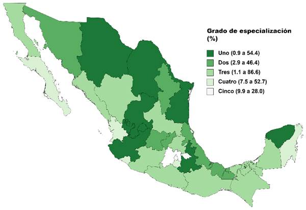 La medida de especialización promedio por mercado y por estado indica que la ganadería bovina en México tiene bajo nivel de especialización, aunque ésta fue mayor para los mercados que para los estados. La especialización promedio de la oferta para los estados no fue estadísticamente diferente de la especialización promedio de la demanda para los estados (P>005); lo mismo sucedió a la especialización promedio de los mercados. Sin embargo, sí pudo comprobarse que existen diferentes grados de especialización en los mercados, fue mayor en el mercado de espectáculos y menor en el mercado para rastro. La baja especialización se explica por la diversidad de las escalas de producción, dotación de recursos y reducido conocimiento de los mercados por parte de oferentes (productores) y demandantes (consumidores).