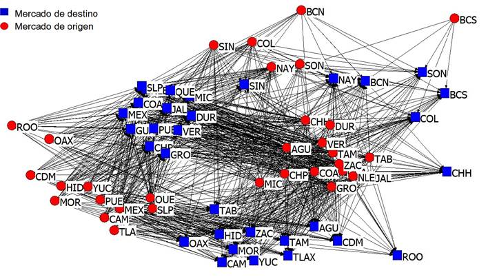 La red municipal de movilización de bovinos en México se compuso de 1,374 municipios de origen (puntos rojos), 1,842 municipios de destino (puntos azules) y 39,068 enlaces comerciales (bordes). Las medidas de la estructura de toda la red fueron bajas; 0.04 de densidad y 52.4 grado promedio. Sin embargo, las medidas de centralización fueron altas, 0.34 grado de centralización, centralización de salida y centralidad de entrada. Las medidas de densidad y grado promedio de la red por mercado fueron menores que para toda la red; pero fueron mayores las medidas de centralidad, el doble en el mercado para espectáculos (Figura 3).