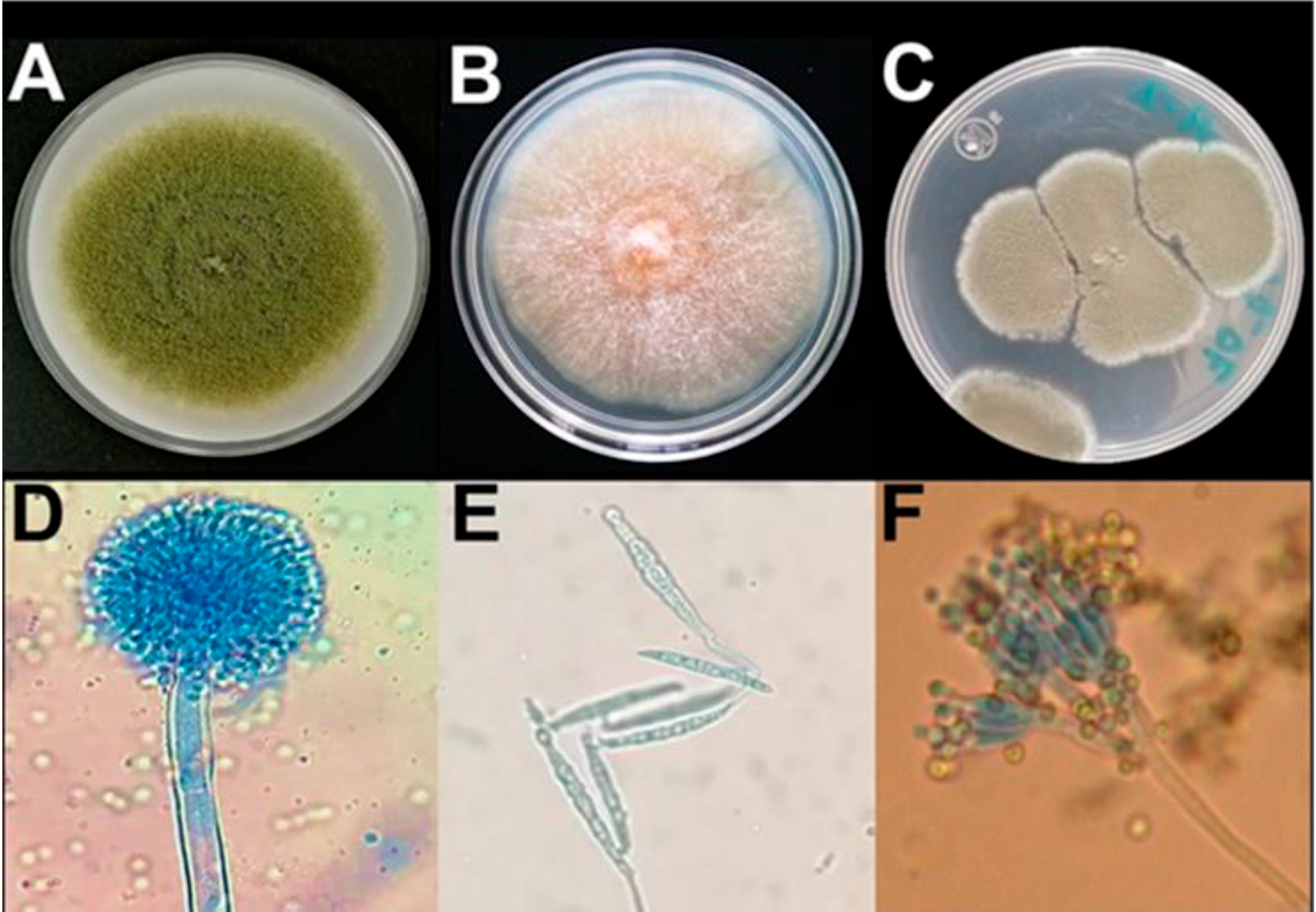 Figura 1 Estructura morfológica macroscópica y microscópica (40x) de los aislados monospóricos. Páneles: A) Aspergillus spp., B) Fusarium spp., C) Penicillium spp., D) Aspergillus spp., E) Fusarium spp. y F) Penicillium spp.