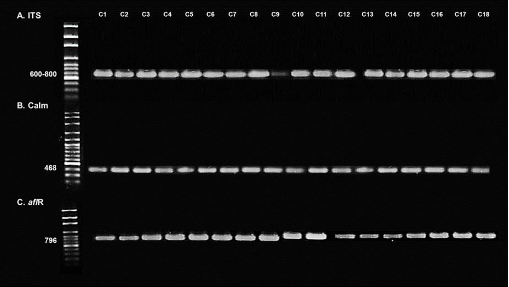 Panel A: amplificación de la región de espaciadores internos de la transcripción (ITS). Panel B: amplificación de Calmodulina (Calm). Panel C amplificación del gen iniciador de la vía biosintética de la aflatoxina (aflR). Primer carril: marcador de peso molecular 100-2000 pares de bases; C1-C18: aislados de Aspergillus flavus.
