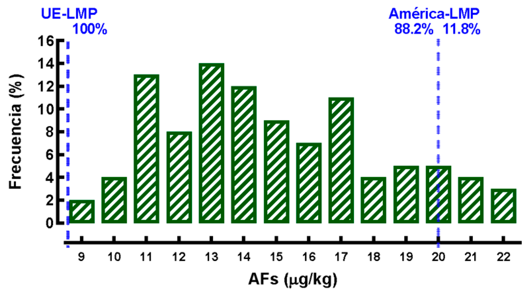 LMP= límite máximo permisible: América (20 µg/kg); Unión Europea (5.0 µg/kg).