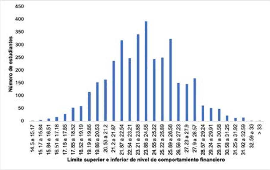 Nota: En el eje horizontal se pondera el nivel de comportamiento financiero obtenido por cada estudiante de las universidades; en el eje vertical se grafica el número de estudiantes que poseen el nivel establecido en los límites superior e inferior. La escala total oscila entre 14.5 y 34.6.