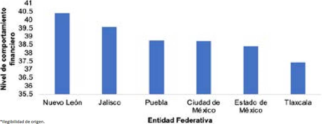 En este sentido, Tlaxcala registró el nivel más bajo en educación financiera, con una ponderación de 10.83, lo que implica un menor comportamiento financiero en comparación con el resto de los estudiantes de otras entidades federativas. Por otra parte, Nuevo León es la entidad con mayor puntaje, lo cual -de acuerdo con la teoría de las finanzas conductuales- tiene relación en que haya sido el segundo mejor calificado en los factores psicológicos, comprobando que su comportamiento varía acorde a las tendencias o a sus determinantes contextuales y psicológicas (Fandiño, 2011; Guzmán et al., 2019a).